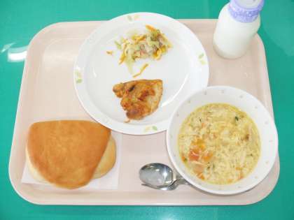 *ミルクパン *タンドリーチキン *キャベツのソテー *トマトと卵のスープ *牛乳