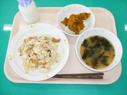 *子ぎつねごはん *かぼちゃの含め煮 *みそしる *牛乳