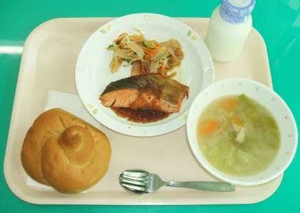 *あしたばパン *サケのステーキソース *こんにゃくサラダ *ABCスープ *牛乳