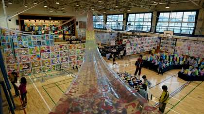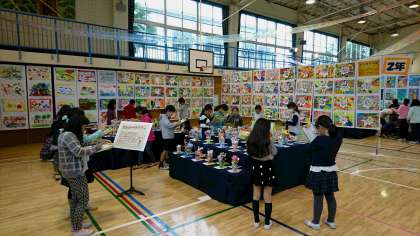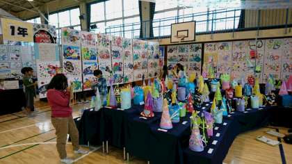 18・19日と2年に一回の展覧会です。小さな芸術家たちの作品を体育館いっぱいに展示しました。今年は、開校45周年記念展覧会ですので、全校児童の共同作品や計画・代表委員会で作ったはなやかケーキボックスも展示しています。