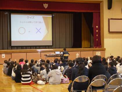 生徒会の人たちから、中学校での生活について教えてもらいました。