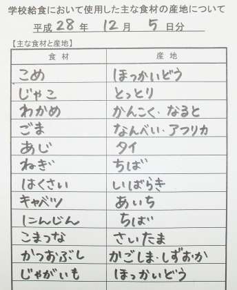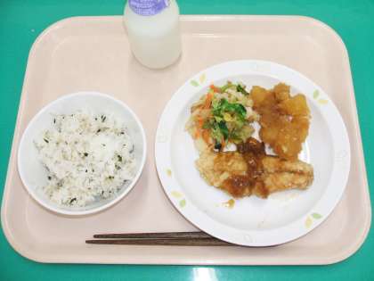 *わかめとじゃこのごはん *アジの南蛮揚げ *野菜のおかか和え *じゃがいもの甘辛煮 *牛乳