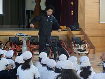 堀江航さんをお招きし、4年生が車椅子バスケットボールのお話を伺い、車椅子バスケットボールの体験をしました。障害のある方も健常の方も共に楽しめるも車椅子バスケットボールの魅力に惹きこまれたひとときでした。(12月9日)