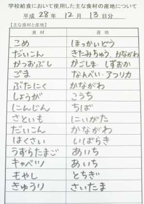 12月13日の給食 公開日 2016/12/16 更新日 2016/12/16 その他の教育活動 *菜めし *ぶた肉と大根のうま煮 *ピリ辛野菜 *牛乳 喜多見中学校から昨日大根をいただき、さっそく今日の給食でいただきました。 ありがとうございました。