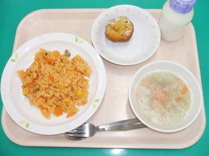 *チーズ入りチキンライス *ABCスープ *カボチャドーナツ *牛乳