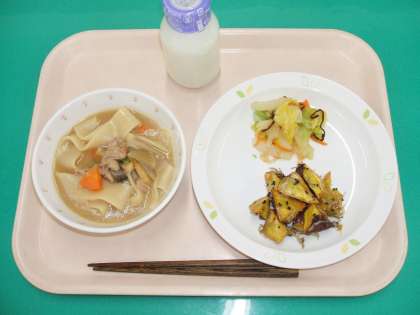 *ほうとう *白菜のゆず風味 *じゃこ入り大学いも *牛乳