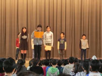 終業式 公開日 2016/12/23 更新日 2016/12/23 その他の教育活動 今日で二学期も終わりです。 三時間目には終業式がありました。 二、六年生の代表の児童が言葉を言いました。 次に集まるのは三学期の始業式です。 みんな元気に集まれるといいですね。 では、よいお年を!!(12月22日)