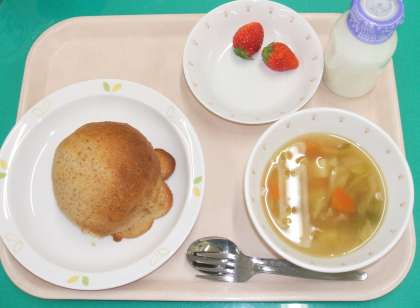 *ビスキーパン *ひよこ豆の田舎風スープ *くだもの(いちご) *牛乳