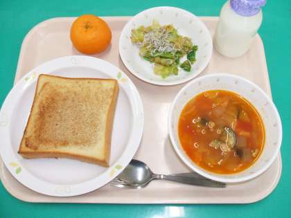 *セサミトースト *きゃべつとしらすのサラダ *なすとトマトのスープ *くだもの(ぽんかん) *牛乳