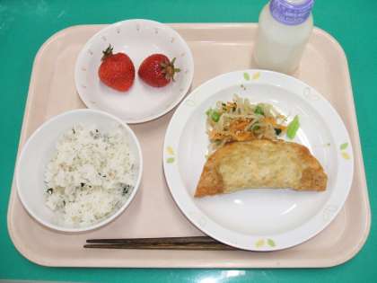 *わかめとじゃこのごはん *ジャンボぎょうざ *塩ナムル *くだもの(いちご) *牛乳