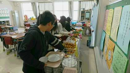 今日は、卒業を前にしたバイキング給食です。事前に栄養のバランスやその量を考えて食べることの大雪さを栄養士から指導を受けてから様々な料理から自分の体のことを考えて料理を選びました。あしたばパン・ゆかりおにぎり・チキンソテー・いかのカリン揚げ・フライドポテト・こんにゃくサラダ・ピリ辛きゅうり・くだもの(せとか)・白玉入りフルーツポンチ・ジョアのなかから選びました。楽しく、美味しくいただきました。