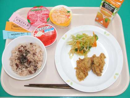 *お赤飯 *とりのから揚げ *ピリ辛野菜 *セレクトアイス *オレンジジュース