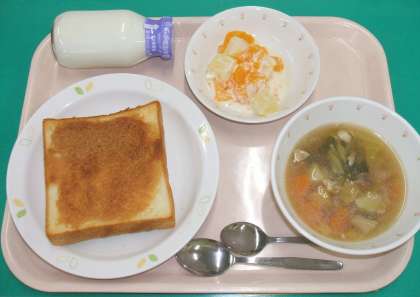 *きなこバタートースト *ひよこ豆のいなか風スープ *フルーツヨーグルト *牛乳