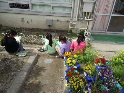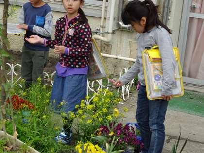 学校を回って、春を探しました。虫眼鏡でよーく観察して、絵に描きました。(4月21日)