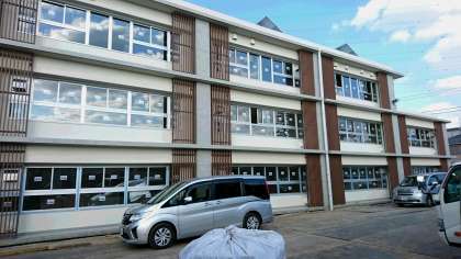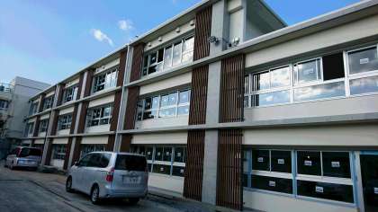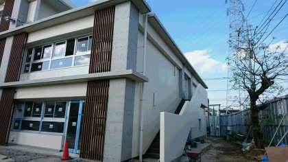 先週の月曜日に新東校舎を覆っていた防音用の布がはずされました。新校舎の外観が分かるようになりました。