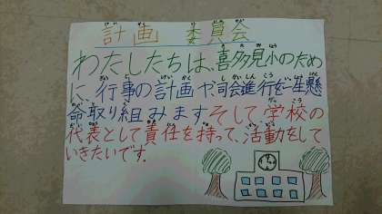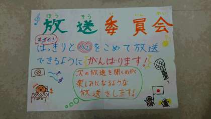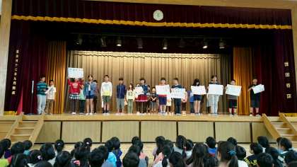 今朝の児童集会は、委員会紹介集会でした。各委員会が話し合って、この一年間のめあてを決めました。それを委員長や副委員長が発表してくれました。