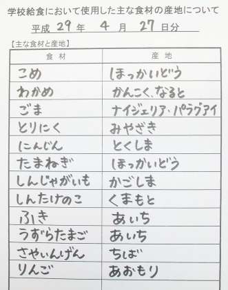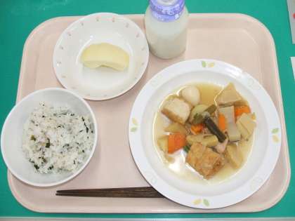 *わかめごはん *春野菜のうま煮 *くだもの(りんご) *牛乳