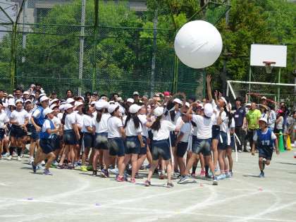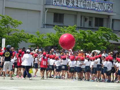 大玉送り 全児童が一緒にやる団体競技です。 勝てるように、赤も白も大盛り上がり!! 結果は引き分けでした。