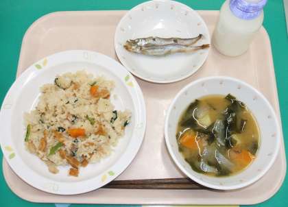 *子ぎつねごはん *焼きししゃも *みそしる *牛乳