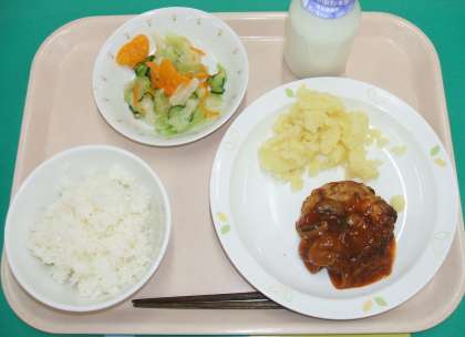 *ごはん *とうふ入りハンバーグ *粉ふきいも *みかん入りフレンチサラダ *牛乳