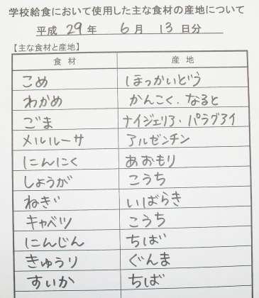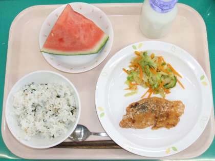*わかめごはん *魚の七味あげ *野菜のしょうが風味 *くだもの(すいか) *牛乳