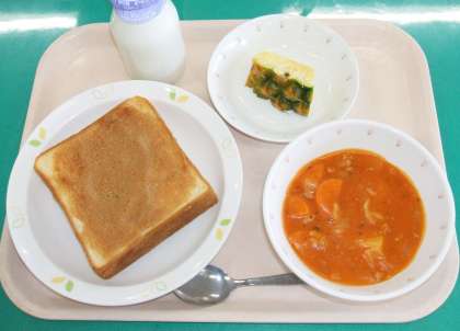 *きなこバタートースト *トマトシチュー *くだもの(パイナップル) *牛乳