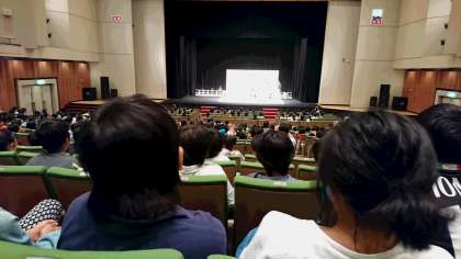 世田谷区民会館で狂言のワークショップと鑑賞をしました。ワークショップでは、各クラスから1名が代表として参加しました。足袋をはいて能舞台で、鶏や茸を演じました。
