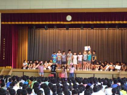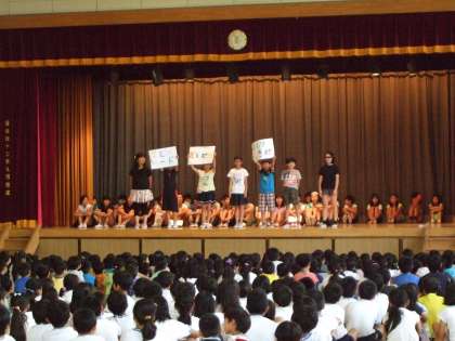 子どもまつりPR集会 その2 公開日 2017/06/22 更新日 2017/06/22 その他の教育活動 子どもまつりのPR集会の第2回目が行われました。今回は4年生と5年生がお店の紹介をしました。4年生は劇のような演出で楽しく、5年生はお店の内容がよく分かる説明をするなど、個性豊かなPRの場となりました。 どのクラスも前日まで協力をして準備を行っていました。