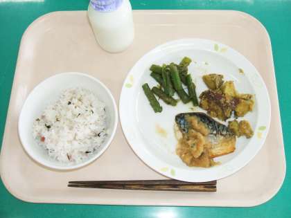 *うめわかごはん *鯖の塩焼き大根おろしかけ *アスパラのおかか炒め *さつまいもの煮ころがし *牛乳