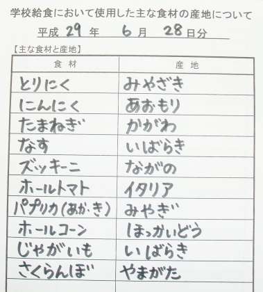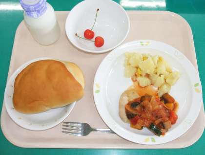 *ミルクパン *グリルチキン☆ラタトゥイユぞえ *コーンポテト *くだもの(さくらんぼ) *牛乳