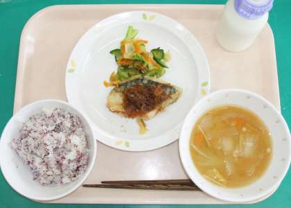 *ゆかりごはん *鯖の南蛮揚げ *野菜のしょうが風味 *みそ汁 *牛乳