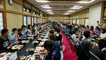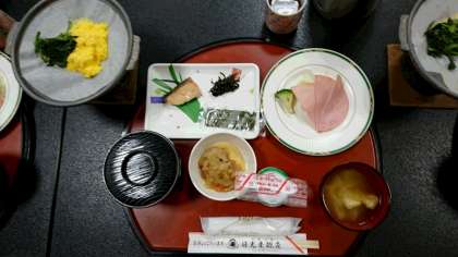 全員元気に二日目の朝を迎えました。昨日から続いていた霧雨のため朝会は旅館のロビーで行いました。その後、朝食をいただきました。中禅寺湖周辺は、昨夜強い雨が降っていましたが、現在は曇りだそうです。ハイキングは、一部を省略しながら予定通りに行います。