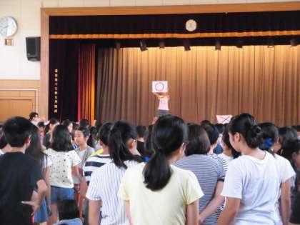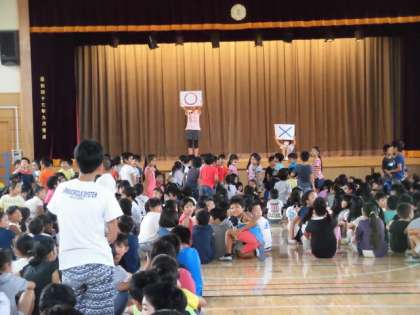 「喜多見小学校は46周年である。○か×か。」という問題には、全員が○だと答えました。正解はもちろん○で、本校の開校記念日は10月2日です。
