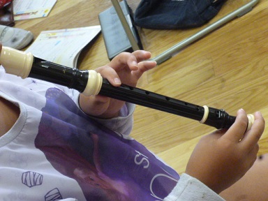 始めに学習する音は、「シ」の音です。それは押さえる穴が少ないからです。3年生の小さな指では、空気が漏れないようにしっかりと穴をふさぐことが難しいのです。そこで2つの穴だけ押さえる「シ」の音からスタートするのです。「高いレ」の音は、押さえる穴が1つですが、リコーダーを支えることが難しく、音もきつい音になってしまうのです。下の写真のように、押さえて吹いています。また、息を吐き続けずに、タンギングという演奏方法を学習します。「トゥ」と言いながら吹く感じになります。