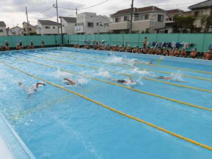 本日、6年生は水泳記録会を行いました。自己記録更新を目指して、それぞれの種目に精一杯取り組みました。記録発表の時には、互いの健闘を称え合う姿が見られました。喜多見記録も更新されました。6年間の水泳の成果を発揮し、またひとつ成長することができました。(9月15日)