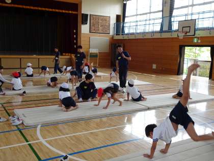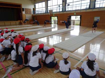 はじめに、学生さんによる模範演技がありました。バク宙やロンダートなど、迫力ある技の数々に子どもたちは大盛り上がり。側転も足がぴんっと伸びてとてもきれいでした。