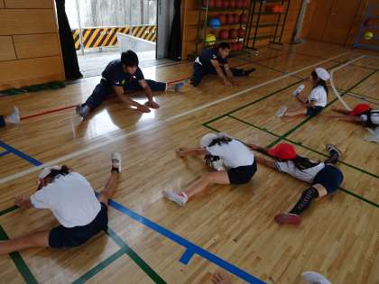 授業の内容は、準備運動、ストレッチ、バランス運動から徐々にマット運動の感覚をつくっていく運動をしていきました。学生さんに優しく教えてもらい、子どもたちも一生懸命でした。
