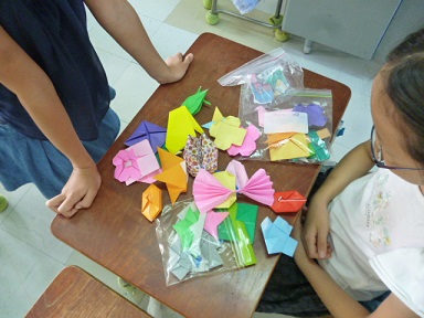 1組の子どもたちは、折り紙のプレゼントを作っています。