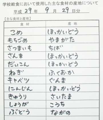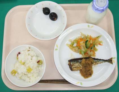 *さつまいもごはん *サンマの塩焼き *やさいのしょうが風味 *くだもの(巨峰) *牛乳
