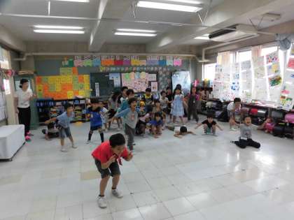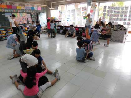 世田谷パブリックシアターの方々に来ていただき、身体を使った表現の仕方を学習しました。だるまさんが転んだをルールを変えてやったり、友達と協力していすやアイスがとけるところ、花が開くところなどを表現したりしました。