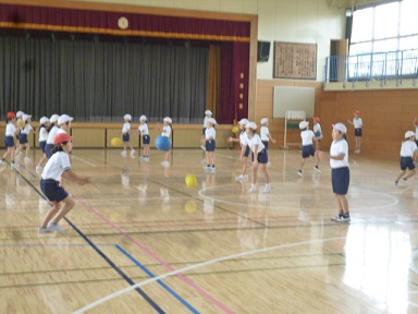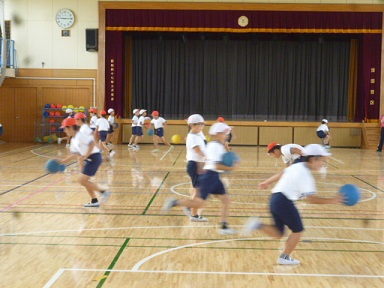 10月の体育館体育は、バスケットボール型のボール運動をしています。ボール運動には、この他にベースボール型やサッカー型があります。スポーツの名前でそのまま呼ばないのは、3年生という発達段階にあわせて、コートの大きさやルールなどを変更して行うからです。