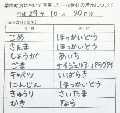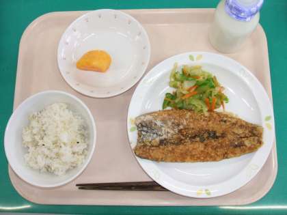 *雑穀ごはん *サンマのかば焼き風 *野菜のしょうが風味 *くだもの(かき) *牛乳