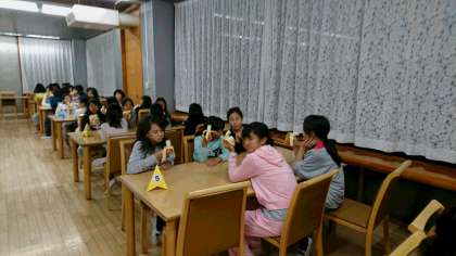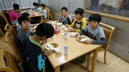 夕食のカレーライスを食べた後、肝だめしをしました。肝だめしの後は、みんなでバナナを食べました。今は、就寝準備中です。明日のハイキングのためにぐっすり眠ります。