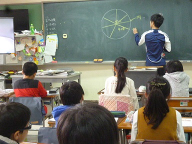 算数は「円と球」の学習を進めています。丸と呼んでいた形が正式には円ということや中心、半径、直径という言葉とその意味を学んでいます。