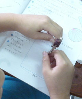 また、コンパスを使って、円を描くこともしています。始めて使う3年生にとっては、上部を持って、くるっと回すということが難しく、両手で回したり線がかすれてしまったりと苦労をしています。大人になると初めからできていたように思うことも、実際は苦労して体得したことなのですね。学年があがっても、コンパスを使うことは続くので、宿題などを通して習熟を図っています。