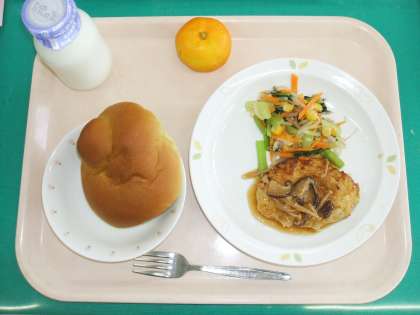 *あしたばパン *和風ハンバーグきのこソースかけ *野菜ソテー *くだもの(みかん) *牛乳