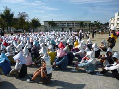 2時間目に避難訓練がありました。今日の想定は、地震があり、放送設備が使えず、津波の危険があるというものでした。