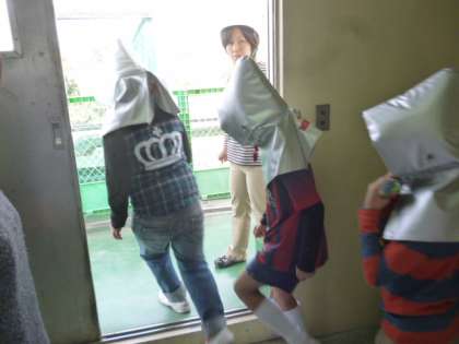 放送の替わりに主事が校庭への避難を知らせて回ります。子どもたちは、決められた階段・昇降口を使って、校庭に避難します。