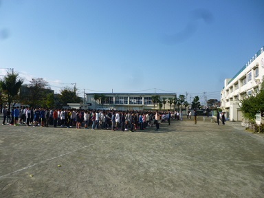 仮設校舎がきれいになくなり、校庭が整備されて、以前の校庭の広い喜多見小学校がもどってきました。久しぶりに、校庭に全学年が横一列に並んだ児童朝会を行うことができました。