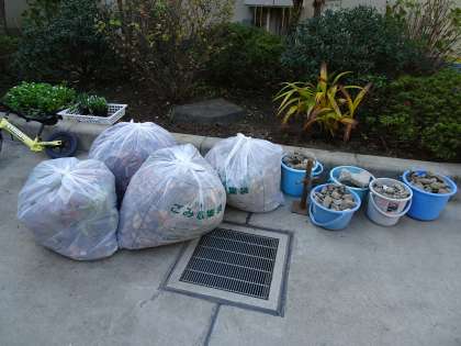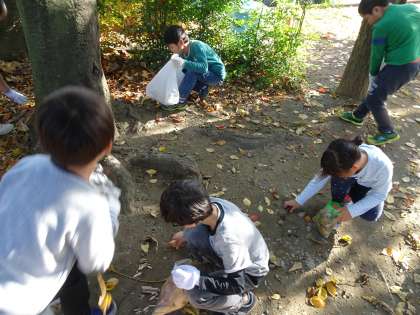 たくさんの落ち葉が落ちていましたが、2年生約150人が一生懸命拾ったことで、あっという間になくなってしまいました。また、みんなが怪我をしないよう、大きな石も拾いました。バケツ5個分にもなり、子どもも先生も主事さんもびっくりでした。